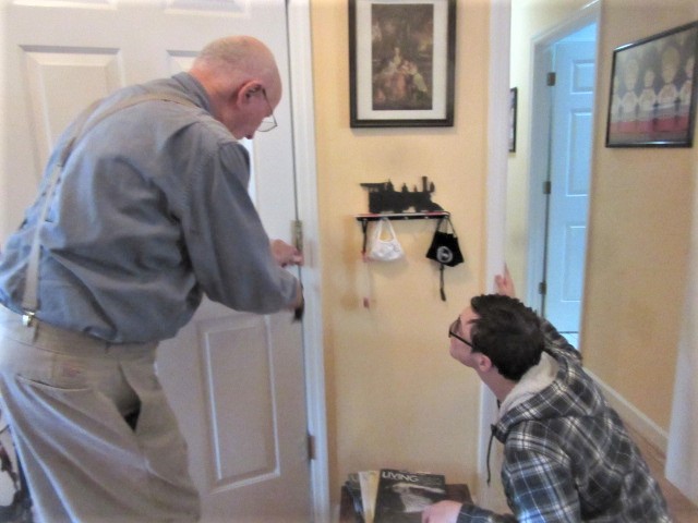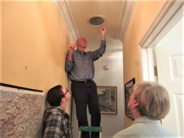 I asked the group to help me make a comprehensive list of the things they worked on, because I knew I did not have photos of everything. If you care to read the list, see if there are things that you could do in your own home. Here it is in the order we remembered them. They trimmed evergreens that had grown above windows, put new batteries in the front doorbell, replaced batteries in a thermostat, planted tulips, removed bugs from solar tubes, rehung a bi-fold door, locked windows that had gotten out of line, moved a very heavy recliner (by taking it apart) to another room, checked a suspected leak in the attic, stopped a bathroom light from flickering, shifted the strike plate on the laundry room door to make it shut correctly, painted a moldy spot on a ceiling, un-squeaked a closet door, and replaced the water filter under the house. The last job was so hard that Bob recommended we get a plumber to do it next time. He and David did not have the tools or strength to do it easily.