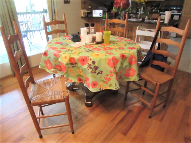 Lise and I went to a thrift shop in Waynesville on a day when David was working. I told Lise there was only one kind of chair I would rule out before looking – ladder back chairs with rush seats like ones I had grown up with. There was a set of chairs that would have worked, but a matching table was included in the price. I had no place to put another table.