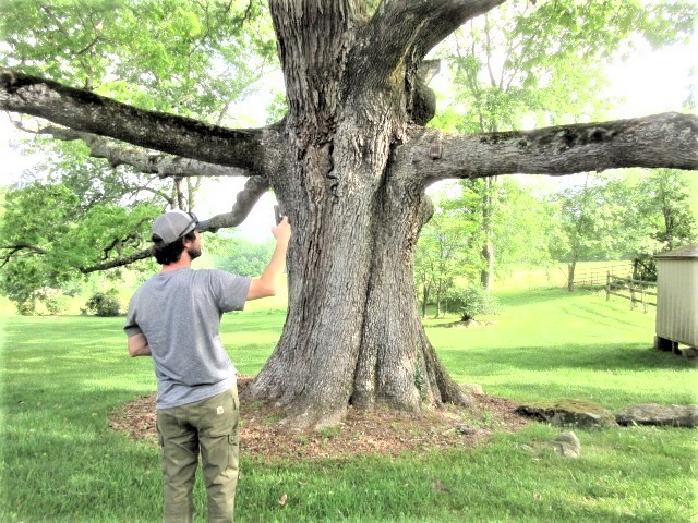 Jeremy, the tree man, met Kacey and David as he went around the property with me to see what needed to be cut or trimmed. Near the old oak tree, Kacey almost stepped on a black snake (a good kind). We all saw the snake, commented on it, and walked away. When Jeremy looked back, he saw the snake climbing the tree! I took a photo of him as he made a video of the snake.