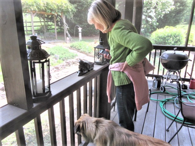 Neighbor Joyce came over to porch sit, since we hadn’t had a chance to chat for ages. As we sat there, she realized birds were making a fuss in the garden. The non-poisonous black snake was there, with three different kinds of birds on the ground near it. They were squawking and jumping. Evidently they were not afraid of the snake. I wondered if they had nests nearby and were ready to pounce if he began to climb. Snake climbed into a low bush at our feet, his body looking like one of the lateral limbs. I took a photo of Kacey and Joyce watching him, only a few inches away. Joyce thinks it might be the same snake that has hung about her house, catching rodents.