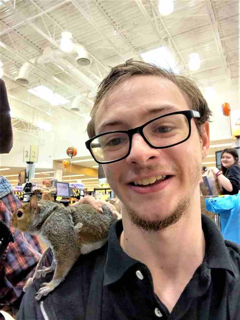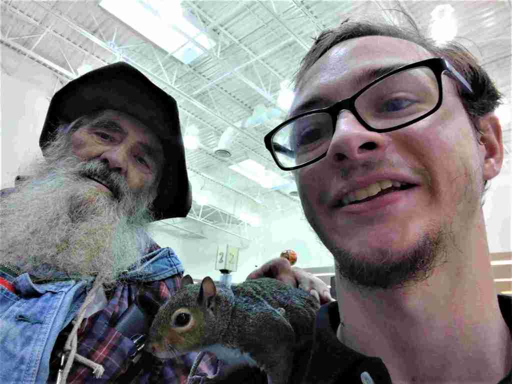One of the cashiers called grandson David over to meet Cowboy and his pet squirrel. The celebrity shops at the supermarket where David works, so many of the staff had already met him. This is the same character that daughter Lise and I met in the waiting room of a doctor’s office. He always encourages people to have their picture taken with the pet squirrel on their shoulder. I thought David did well with his selfies.