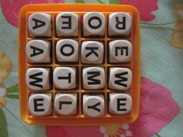 I’m so glad I went right to the table and took a picture. We needed proof of his great find. I texted Lise the photo and challenged her to find that word. She wrote back, “Challenge accepted.” She said later that she found it in 10 seconds. Just in case you want to look for that word, I won’t give you the answer right away. The letters have to be connected by a corner or side, and you can’t repeat the same letter block.