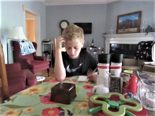 Logan is full of fun, but he can also concentrate on a goal, and currently that is to beat daughter Lise playing Boggle when she comes in July. He is winning consistently against me, but so does Lise. When the neighbors gathered for a Memorial Day cookout, Logan played the game by himself. He was deep into a game when I took his photo.