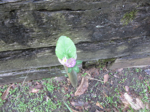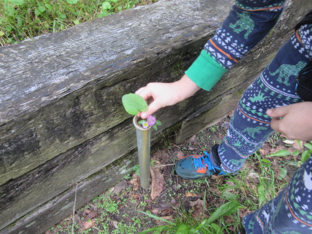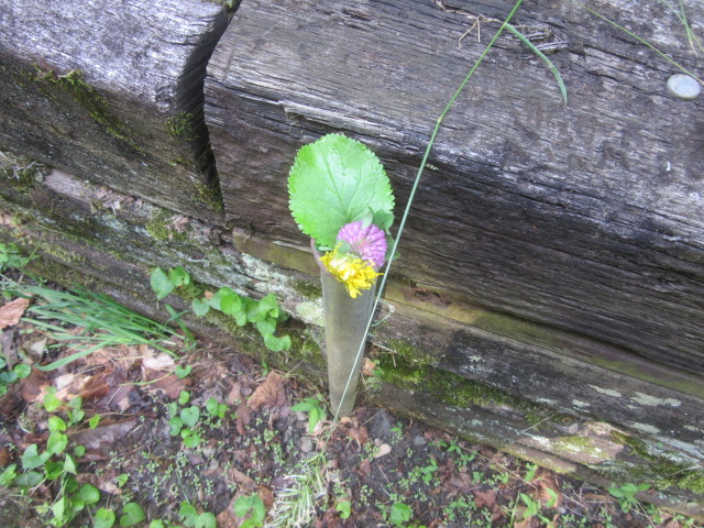 We reached the place where railroad ties hold back a steep hill. There are lots of wild flowers blooming right now, and Logan was looking at them closely. Two pipes help hold up the ties. He decided they needed flowers and promptly arranged some. The next day I looked as I drove past, and they were still there, looking perky. Only dog-walkers might be close enough to notice.