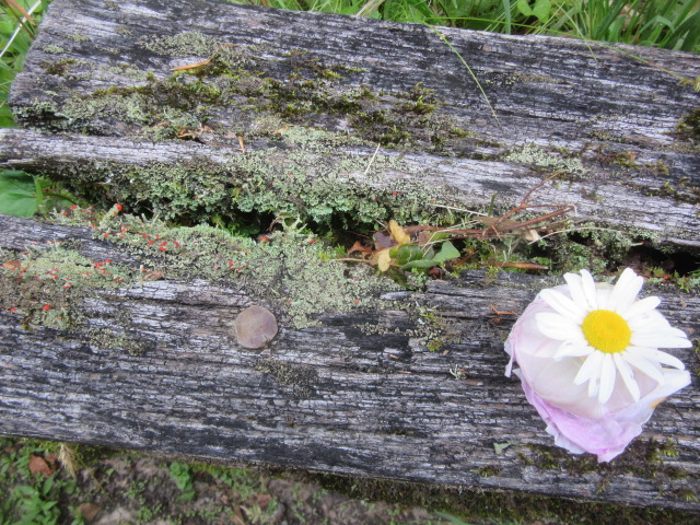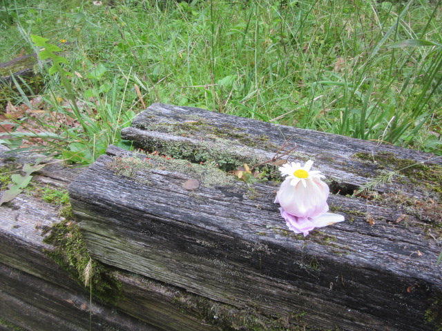 There are peony bushes half way to the stop sign. Logan picked up a spent bloom from the ground, letting the petals fall away. By the time we came back, only the inner petals were hanging on. It looked like a large clove of garlic. He squished it a bit and made it a vase for a daisy-like flower. He has watched the miniature garden with red blooms, just as I have, and that’s where he put his creation. You may not be able to see the red bits, but they are there.