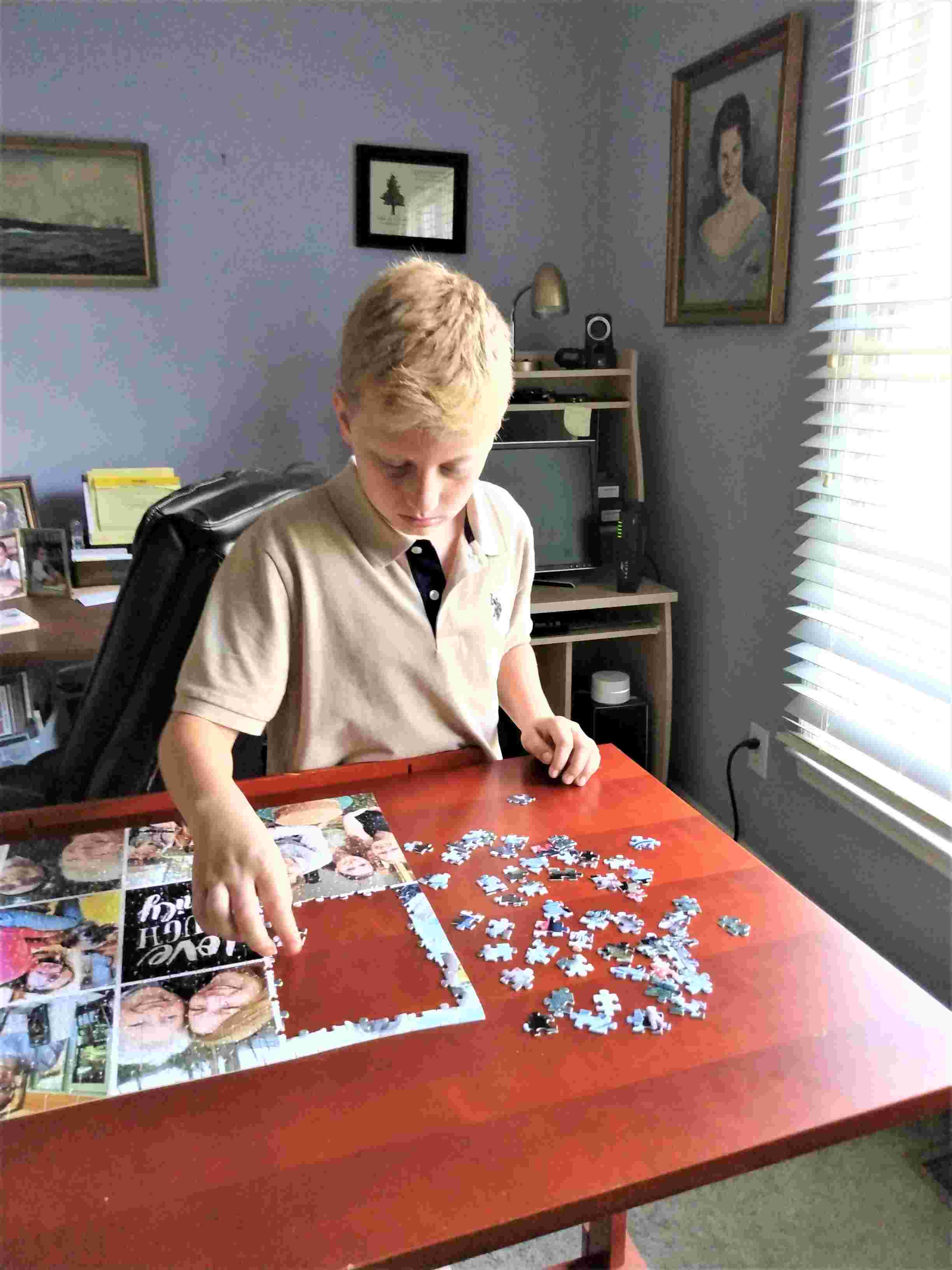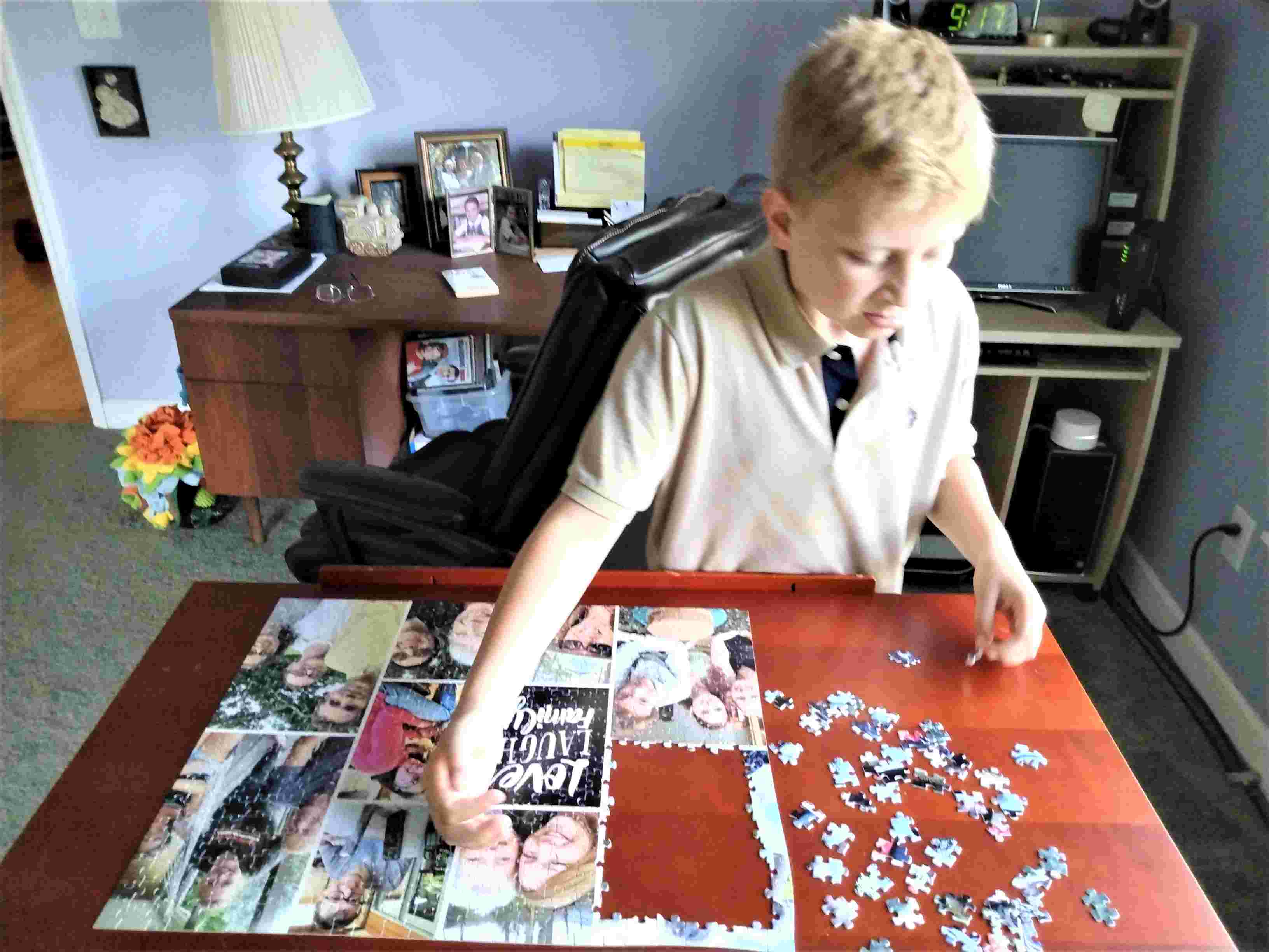 Shawn and Bob were driving up our street on their way to a doctor’s appointment, and they asked if Logan could stay with me. Yes! Yes! and Yes! He could have stayed home alone, but they know I’m always eager to spend time with him. As they drove out of sight, I told him I had something to celebrate birthday month for him. His 14th birthday is next week. I’ve written before that blogger Linda picks out family photos from my blog during the year and has them made into a jigsaw puzzle. When it came months ago, Logan saw it and saw that he was included for the first time. Kate and I worked it, then we took Logan out of it, leaving the corner edge. I hoped he would want to put himself together, and he began immediately.