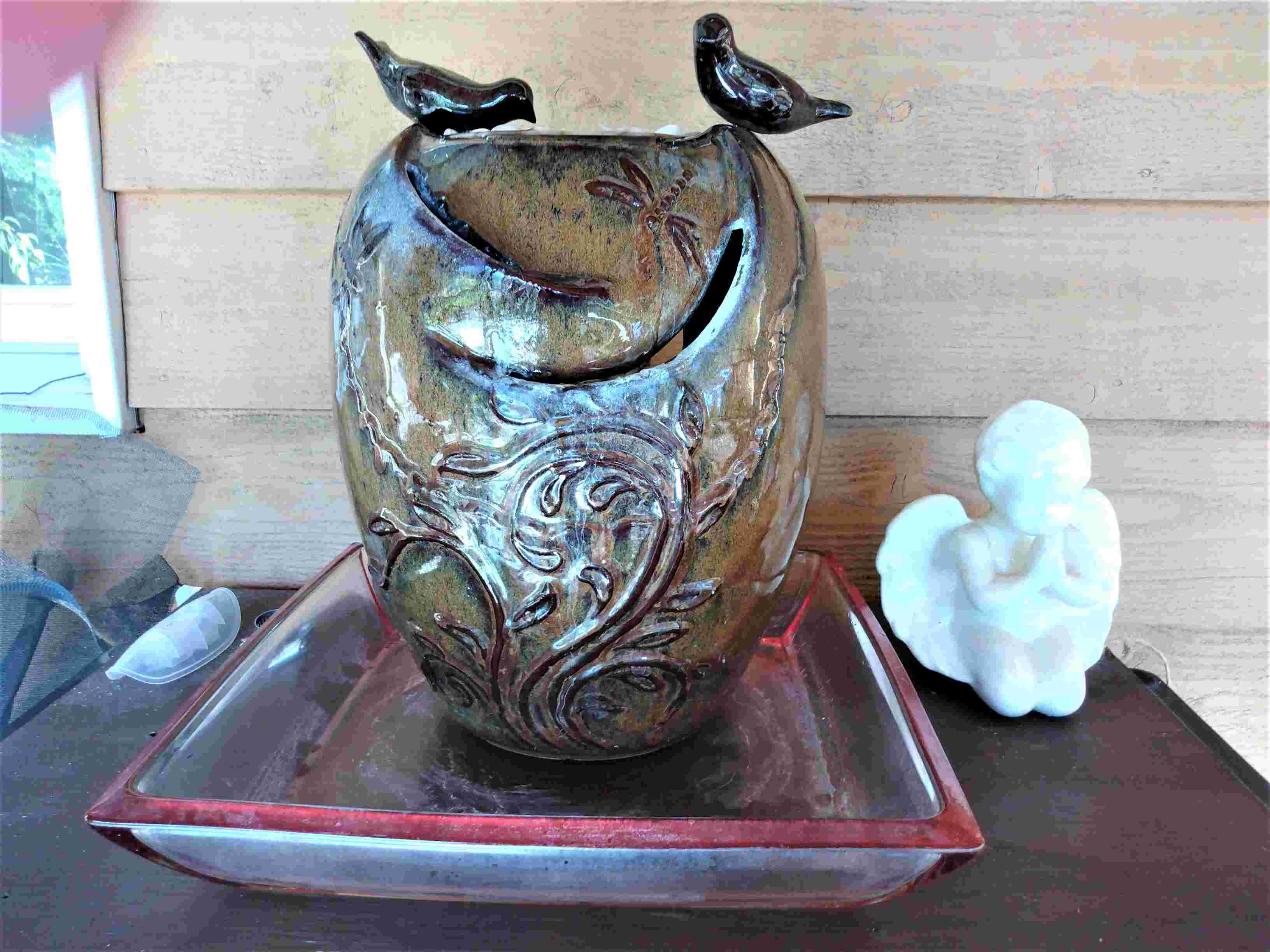 Neighbor Logan opted to stay with me while his parents went somewhere, and we had shrimp and grits for a late lunch. I was paying more attention to the meal and whether he would like it (he ate it), when I should have watched the fountain. Usually I turn it on, moisten the water pathway, and check to make sure water isn’t hitting the front lip to splash into the glass bowl below. When I was cleaning up after the meal, I glanced through the kitchen window and saw ALL the water had flowed out. I rushed to turn off the pump and told myself I’d worry about it later.