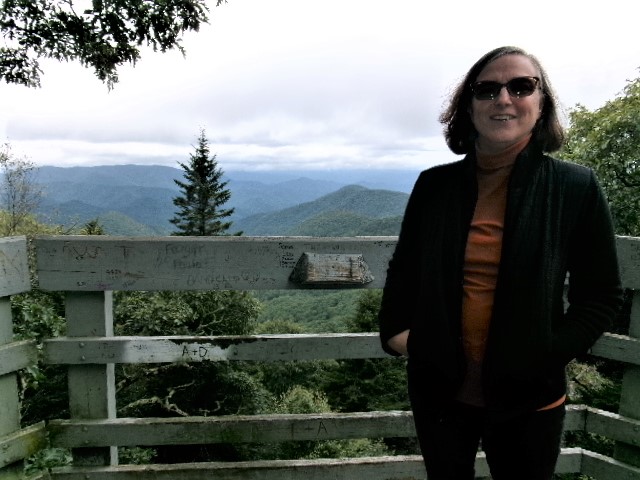 My favorite photo of our drive on the Blue Ridge Parkway was of Kate with the mountains in the background. The day was bright and sunny in the morning, but by the time we drove there, mist shrouded many views. We drove slowly through every overlook until we found one with a view. We ate a picnic lunch in the car while watching the clouds play with the mountains. A sign said there was a pedestrian viewpoint. I was not aware of anything like that, so we walked on a short trail and found this delightful spot.