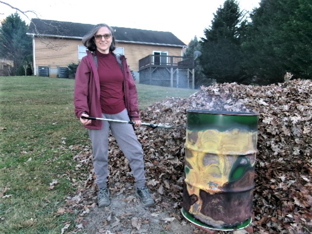 Kate did it my way, using the burn barrel. We were out there from 10 in the morning until after 4 in the afternoon. Kate got a really hot fire going and burned about a third of the pile. I’ll admit I was wrong. It probably would not have taken as long to do all the leaves at the same time. About half way through, I went inside to make us a picnic lunch, since we wouldn’t leave the fire unattended.