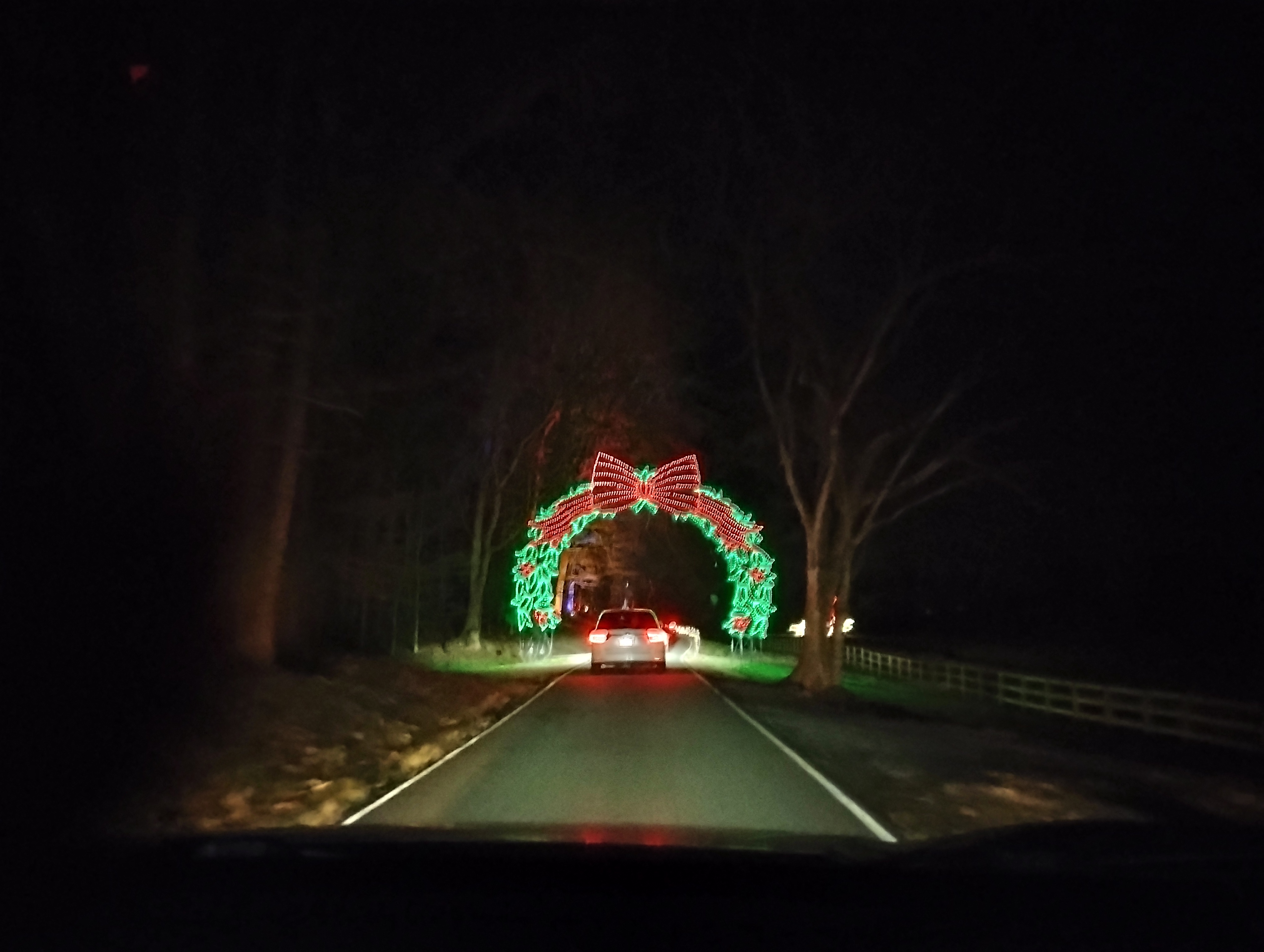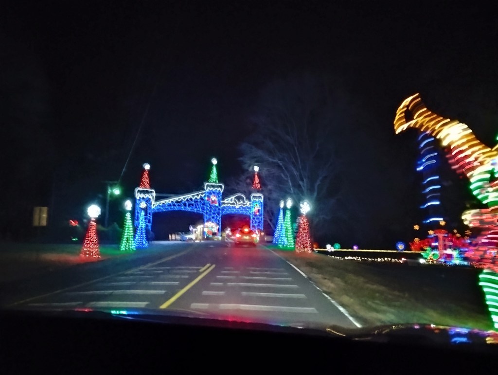 When the computer project was completed, Bob said, “Let’s go see Christmas lights!” They knew Tanglewood Park had a spectacular display to drive through. I couldn’t help exclaiming over all the lights that made things appear to move. It might have taken half an hour to go through the whole thing. I picked two photos to show a tiny bit of what we saw.