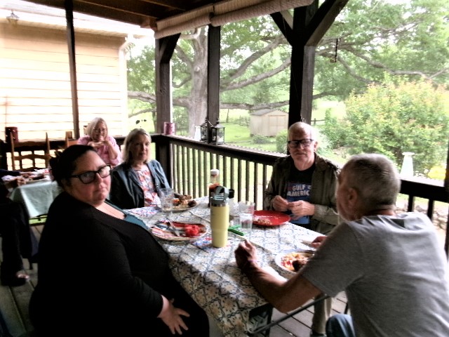 To keep y’all up to date, here is a photo of us as we ate lunch on Memorial Day. J brought his grill through our side yards, and we decided to put it on the back porch because of threatening rain. He said later that he liked it, because people were out there talking to him as he cooked our hot dogs and hamburgers. No one realized he felt cut off when we stayed inside while he cooked. Years ago we began to bring our own meats and a side dish to share. That has worked well for us.