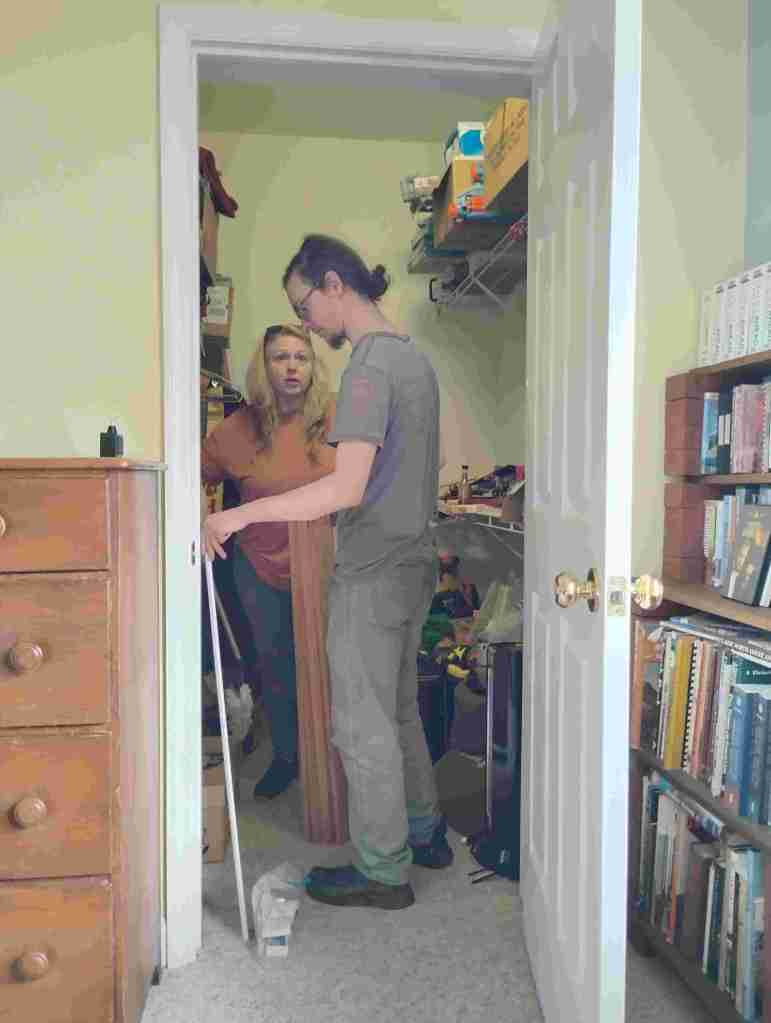 If only I had 2 such energetic helpers! The chest by the closet where Lise and David are looks exactly like the one I have that was my parents’ when they first married. It had a dresser and bed. My son stripped all the paint that had been applied over the years and restored it to the original finish, which appears to be a reddish maple or perhaps cherry wood. He removed the knobs (same as your chest) and put new ones on, but I saved the originals and sanded the layers of paint from them, intending to put them back on the chest. They are still waiting for me to do it.