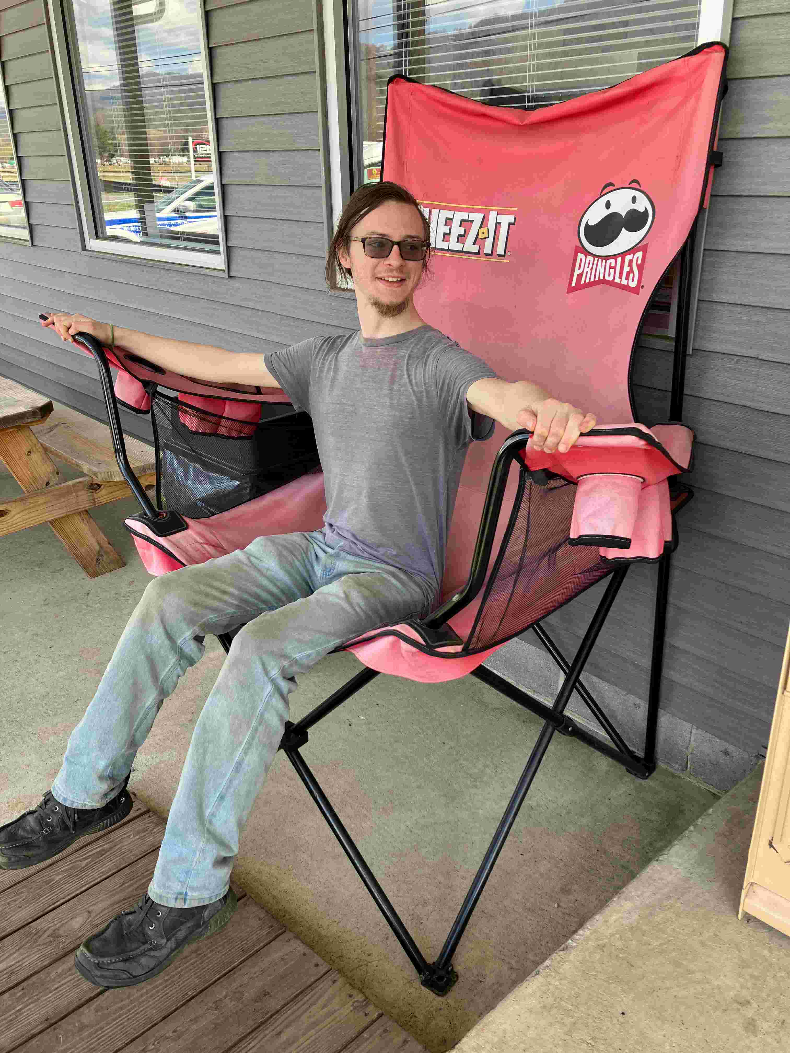 Our lunch destination was the barbecue joint closest to my house. On the porch was a giant chair that David had to test, and I had to photograph (family imperatives).