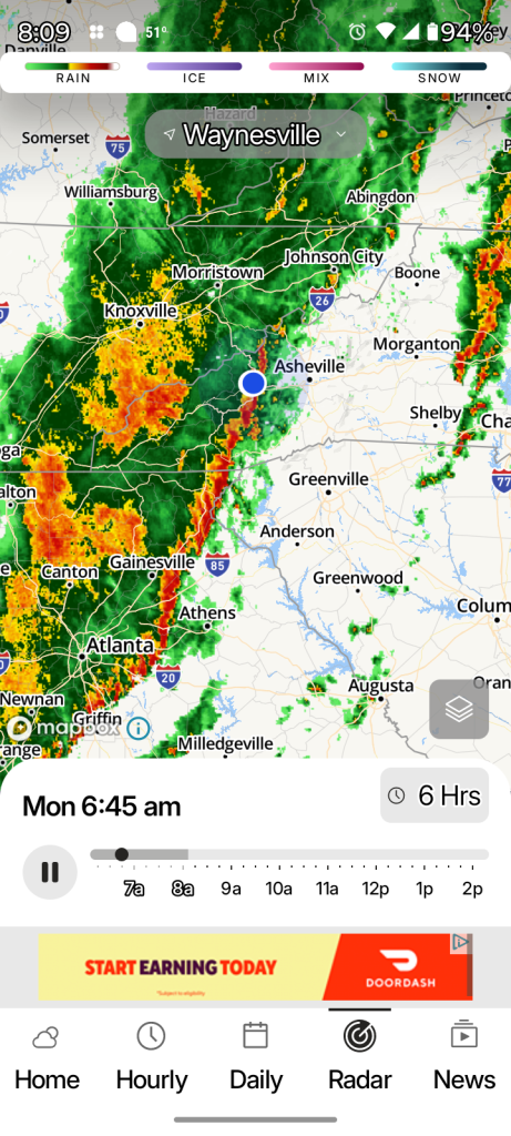 Daughter Lise adores thunderstorms, and one day before she was to leave, she woke twice in the night, seeing light through her eyelids. An hour later I woke, looked at the weather radar, and texted her to expect activity soon. I woke for that round. It was super!
