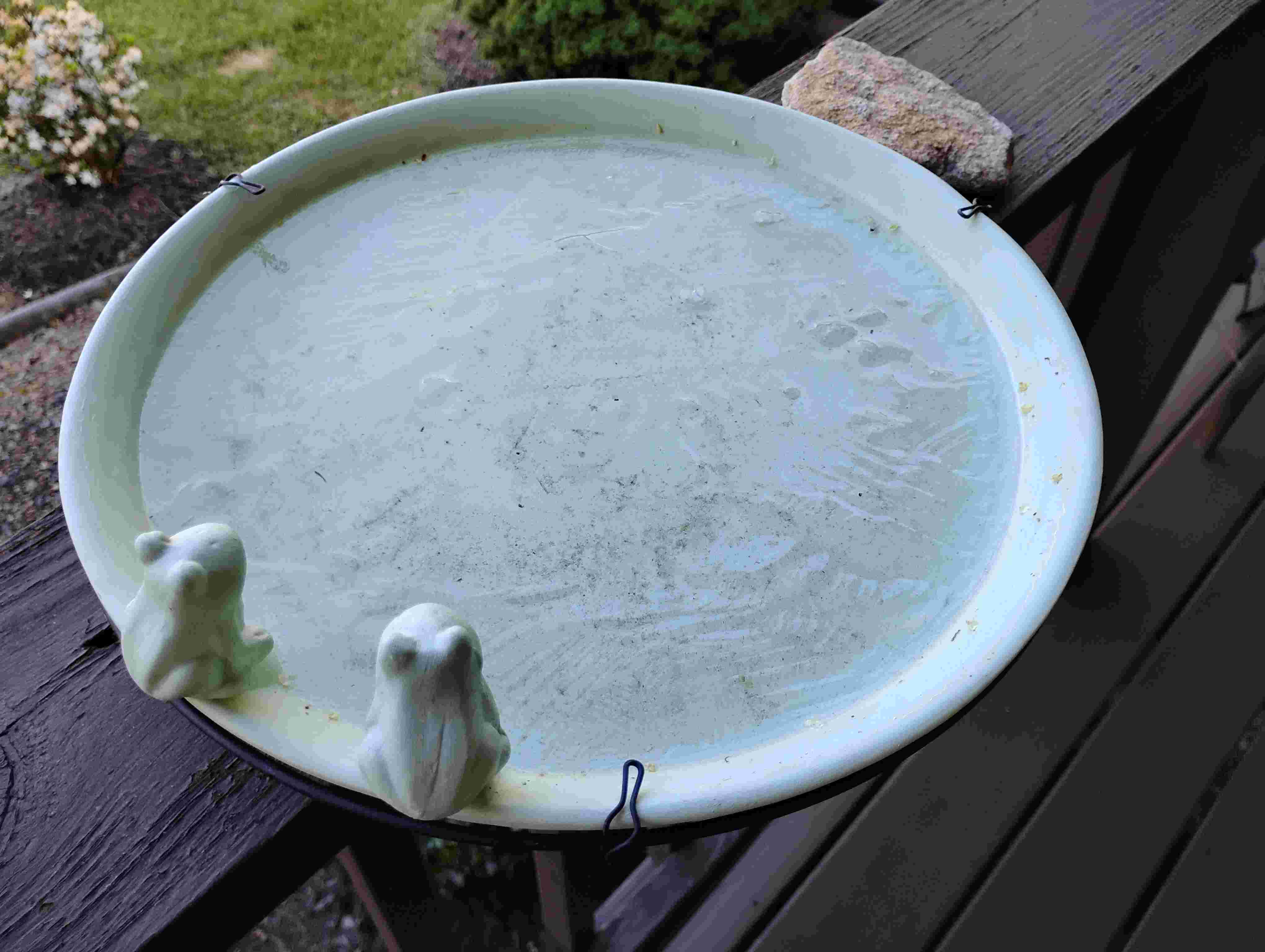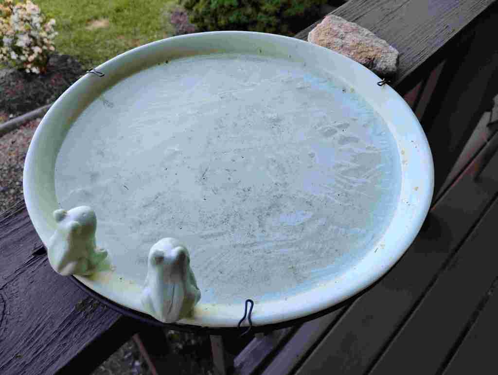 Hurrying to the feeder on the front porch, I found the moat had not frozen, but the birdbath had!! It is very shallow and responded to all that cold air swirling about.