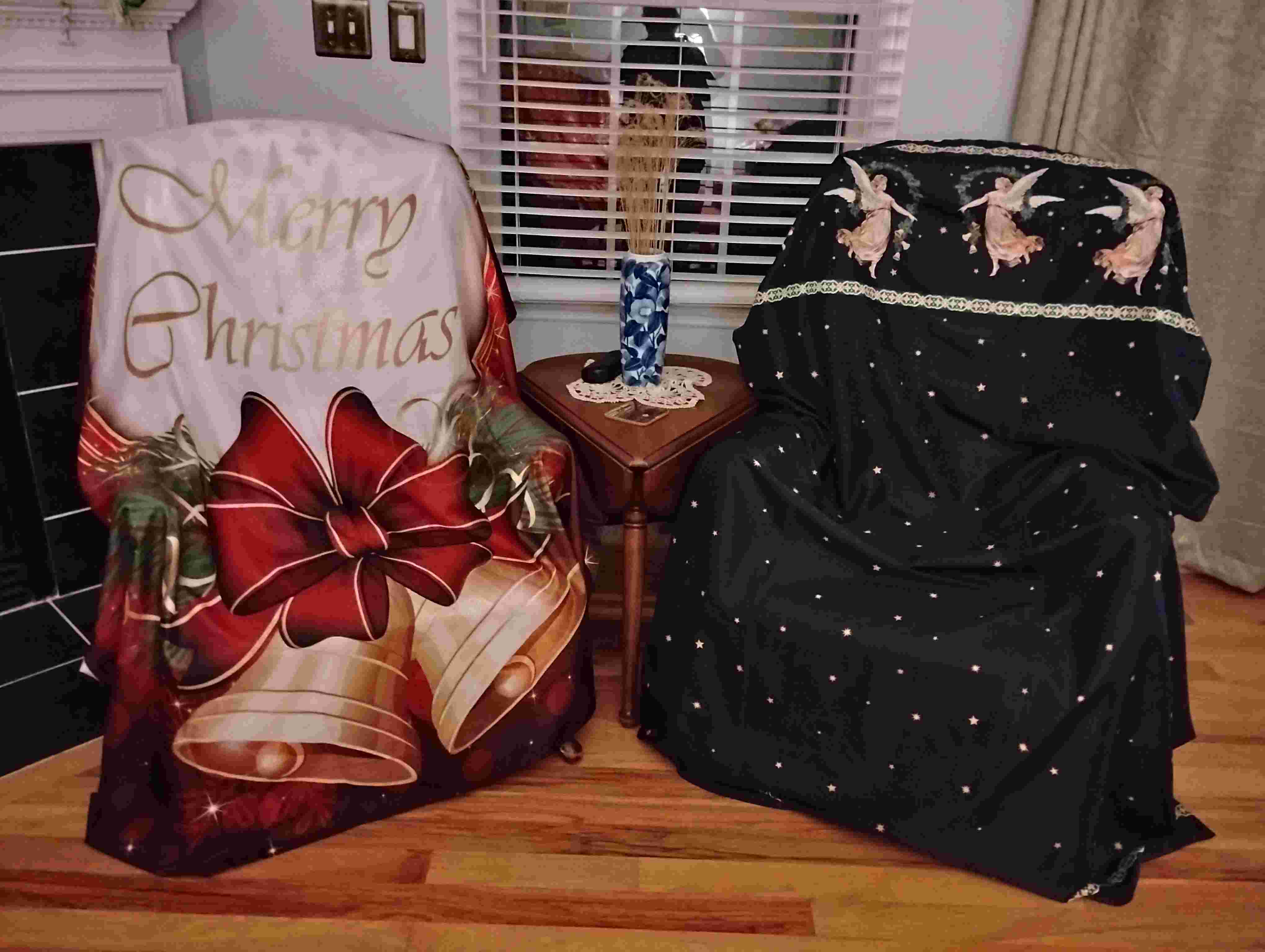 I washed the Christmas shower curtains before putting them away. For drying, I draped them over furniture on the back porch. The moisture was gone almost immediately, but I wanted to make sure they were completely dry. Bringing them inside, I tossed them over chairs and left the room. When I came back, the first thought I had was that someone had put dust covers out in preparation for a lengthy absence. English movies have shown such a scene when the upper-class family was going for a stay in their country home. All the furniture would have been shrouded in dull covers to keep them clean. My chairs felt very special, being covered in Christmas glory.