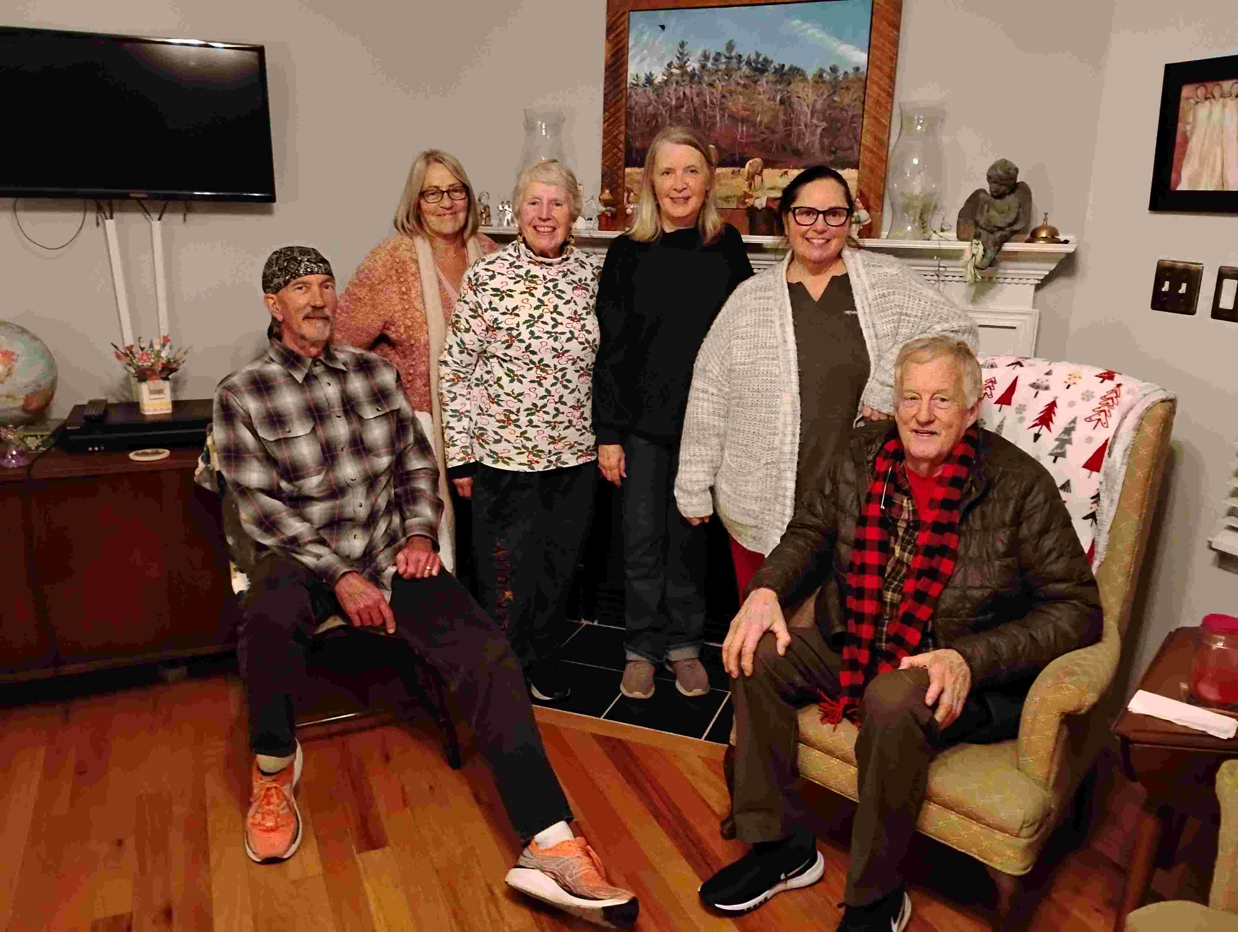 Cindy lives on a different street, but she is part of our neighborhood. She had just come back from visiting her daughter and family for Christmas. She says she always comes home sick, and this time it was a chest cold. Since she stayed home to protect us, we took a photo to send her. The pajama-clad one volunteered to take the photo with my phone.