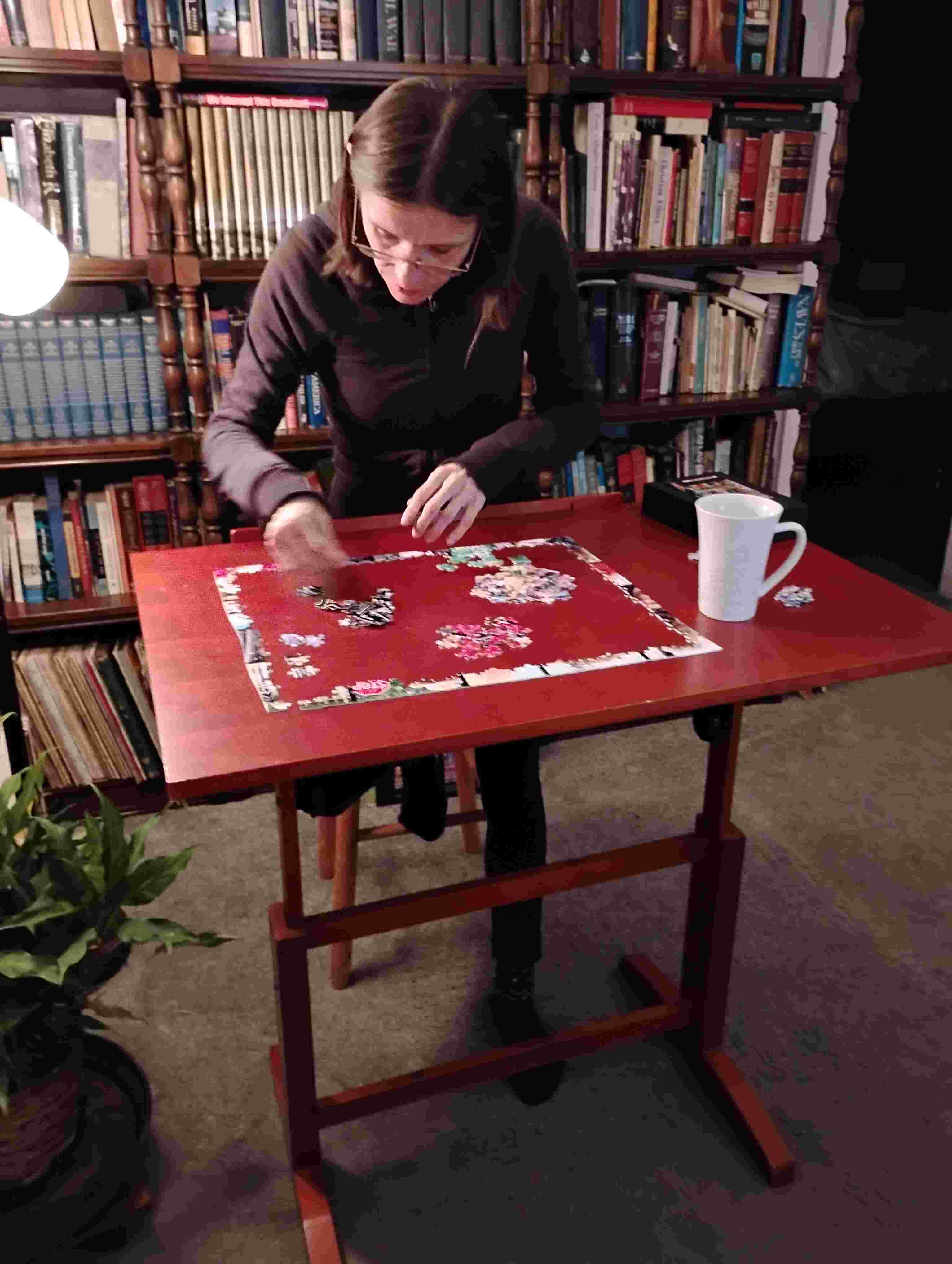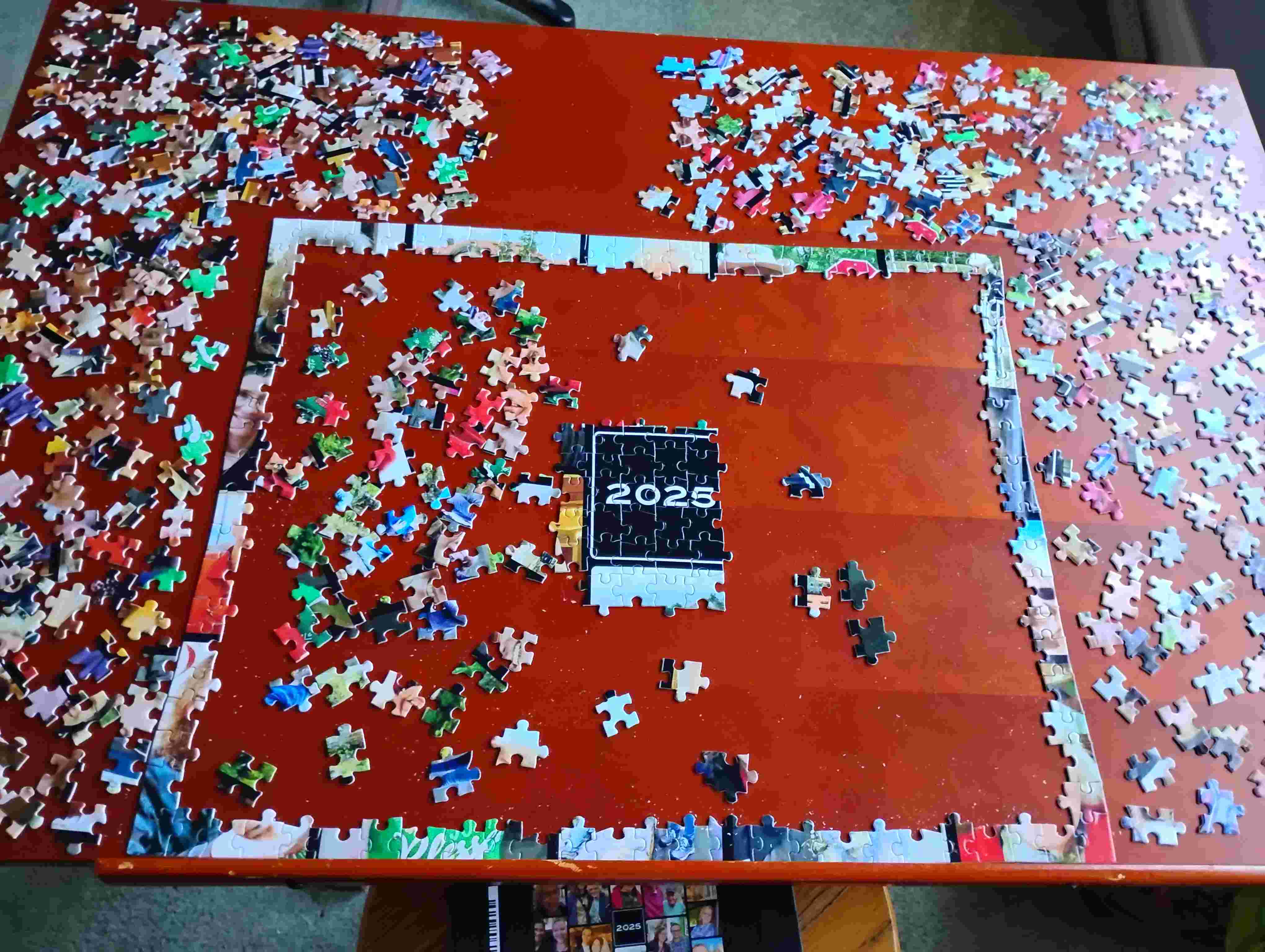 A few days ago I took the innards of the family jigsaw puzzle apart, leaving the outer edge complete. I cheated, though. I put the left section of pieces on the left side of the puzzle, and the right pieces to the right. The middle was jumbled, but still in the middle of the puzzle. I have been delighted to work on it, putting in a few pieces a day. It’s so easy when I can see the pieces near where they belong, otherwise I’d be endlessly walking around the table. I may take it apart that way, putting the pieces in three separate plastic bags. I will definitely thank myself if I do that.
