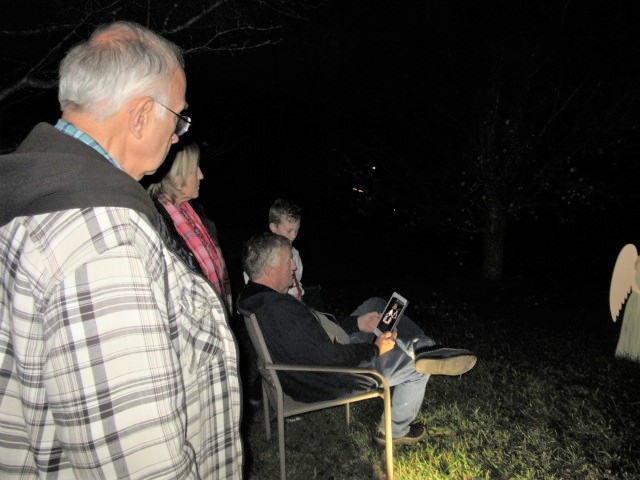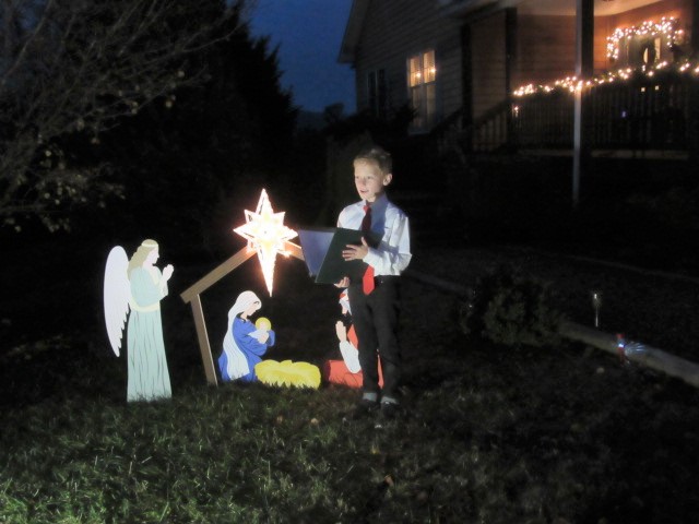 Neighbor Logan (10) practiced reading a lesson to be taped and incorporated in a service at his church. He chose our nativity scene as the set for his reading, and the star provided enough light for him to see the words. He did a fantastic job. We hope to see the service with this video in it.