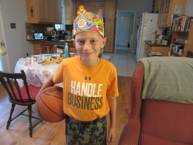 Hours later when we came back from an errand, we heard Logan shooting hoops at the bottom of his driveway. He ran up to the street to speak to us. Would he be willing to let me take his picture while wearing one of the crowns? Yes, but he wouldn’t stay because he was waiting for his dad to start a project.