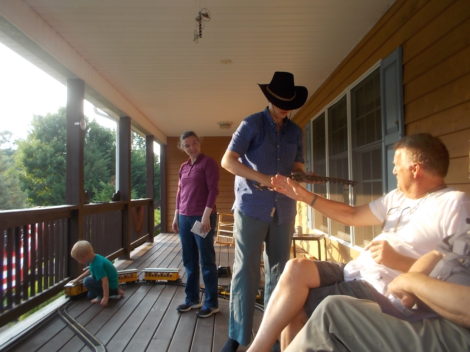 Dennis is a couple of years older than Nathaniel and was over here many times when he wasn’t working at Burger King. The fellows had fierce Nerf gun wars and Backgammon battles. Both were always willing to eat any homemade dessert that needed to be removed from the old folks’ reach, strictly for their health, of course. There were card games, balloon battings, rescuing of an airplane after wild launchings, and running of trains on the front porch. The one thing I know they both wanted to do and didn’t was climb the 200 year-old oak tree.