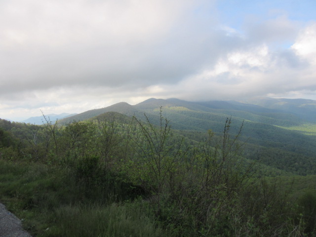 David had been longing to go up on the Blue Ridge Parkway, so we headed there after everyone went home. Often cloudy day scenery is more exciting than that under brilliant sunshine. We had several things – rain, fog, and sun. It began to rain while David and I were enjoying Sunburst Falls. The stream had more water than usual, making it louder and more visually interesting to us.