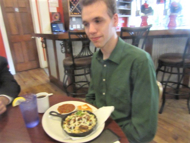 On our way to take Nathaniel back to his dorm, we ate at Flat Rock Wood Room not far from Carl Sandburg’s home. We were surprised to find any restaurant equally featuring barbecue and pizza. I thought the food was tasty and served imaginatively. The fellows all had a skillet filled with macaroni and cheese, topped with barbecued pork. David’s side dish was fried sweet potatoes in a tiny bucket. I had shrimp and grits with barbecue sauce.