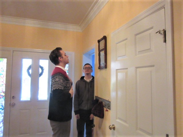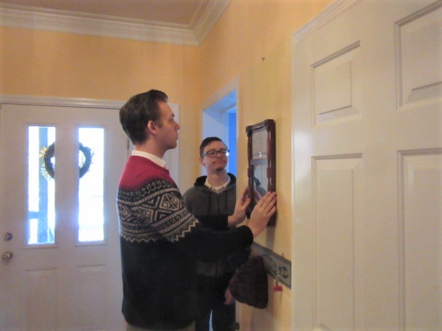 Grandson Nathaniel and friend Sarah came to visit after Christmas and after the proposal. She is now officially his fiancee, and everyone is very pleased. We have photos from the mirror ritual. Nate raises the mirror on arrival and lowers it when leaving. Everyone participates, but I didn’t get the dog in the photo this time.