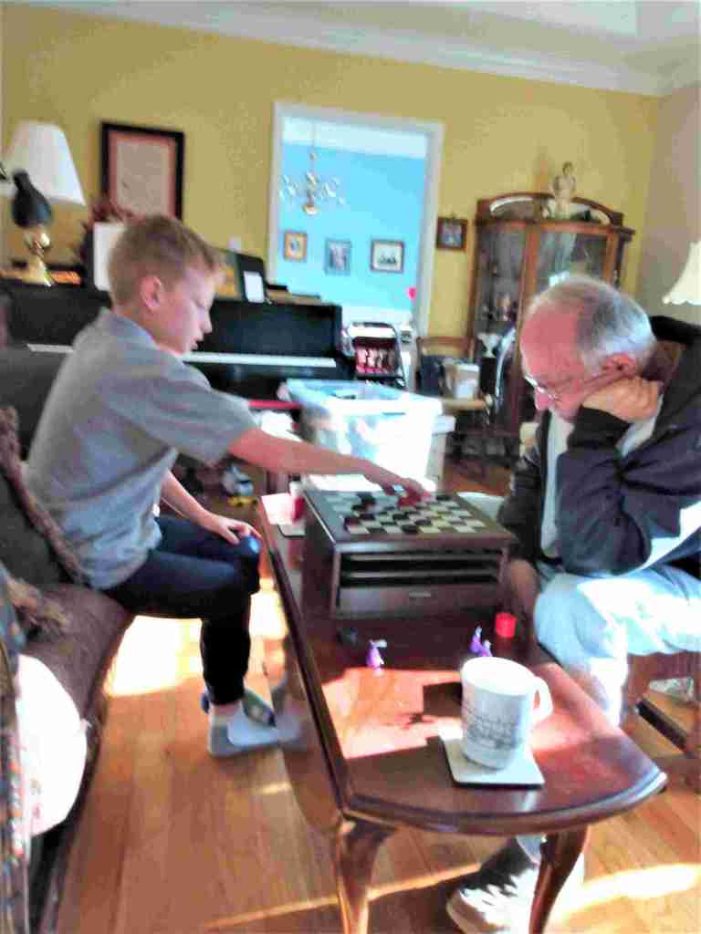 We think Logan’s sense of appropriate behavior is far above average. He waited until John paused to ask what he came over for. “Could we play checkers?”