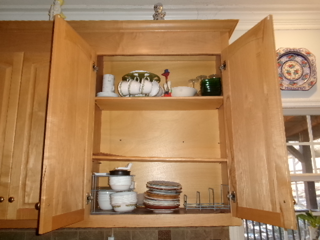 I was putting clean dishes on the middle shelf of an upper cabinet when one large plate rolled forward and fell to the floor. It was a plastic plate and didn’t break! I was mentally processing that, with eyes searching the board for the cause. One peg had failed, tilting everything forward. Amazingly, the board rested on six Corelle plates, upright in a rack. I gently removed all the dishes on the shelf and temporarily stored them in a bottom cabinet. Getting a new peg would have to wait, because I was in the middle of exploring a new laptop.