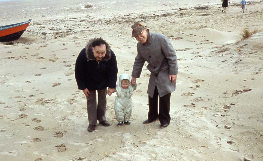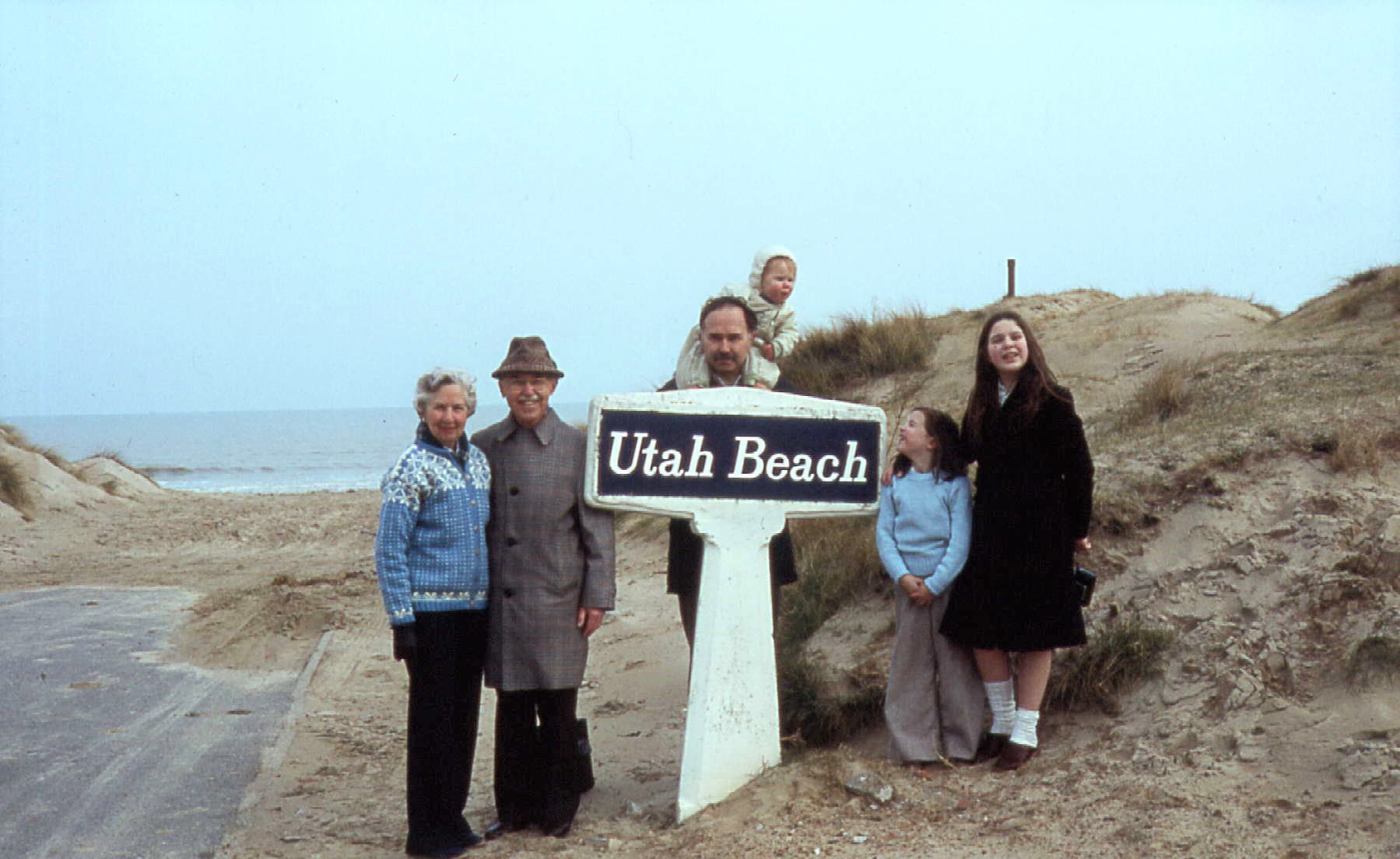 Here we are situated in a very lovely French Hotel in Cherbourg, France. It’s about 5:30 p.m. French time which is one hour earlier than Greenwich time which is six hours earlier than Standard Time. We have just returned from a very interesting trip through Normandy countryside. What a delightful area! There are many, many old farms here, apparently occupied by several generations. They are all made of brick or stones cemented together. The farmers were out cutting down the hedgerows which break up the fields into small plots. Our main objective was Utah Beach where Dad landed on D-Day. We walked on the beach, climbed up and down the dunes and looked at the remains of the gun emplacements which were partially dug into the dunes.