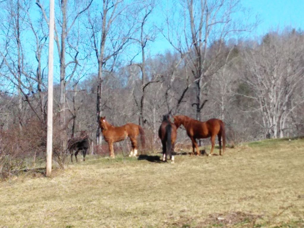 There was a bit of excitement in the pasture today. As we sat down to eat, John noticed horse DW lift his head and stand in an alert pose. DW watched something intently, then trotted to the fence. Soon a horse approached the fence on the other side. Vixen joined them as a second horse arrived. All four have stayed close to the fence, watching each other as they graze. We tend to look for the animals as we sit down to eat, and they often keep us entertained.